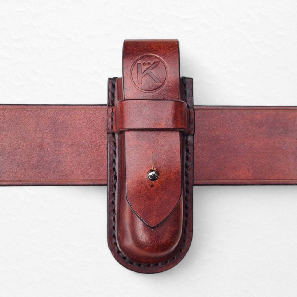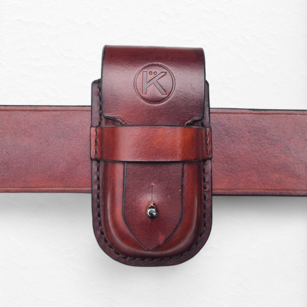 Custom two-compartment sheath build in wet moulded vegetan leather. Also custom coloured to match the set.