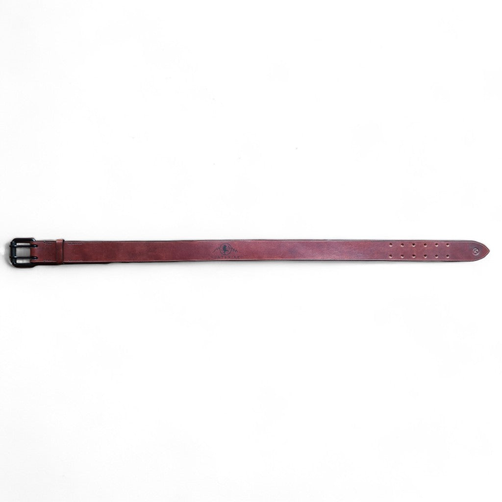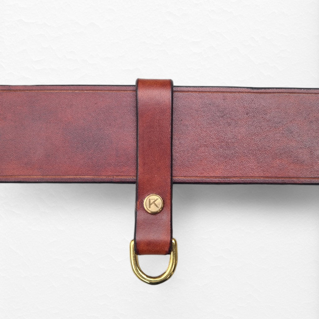 A 2"/50mm belt in sturdy 9-10oz / 3,6-4,0 mm high quality bridle leather. Custom coloured, greased and waxed on the edges.